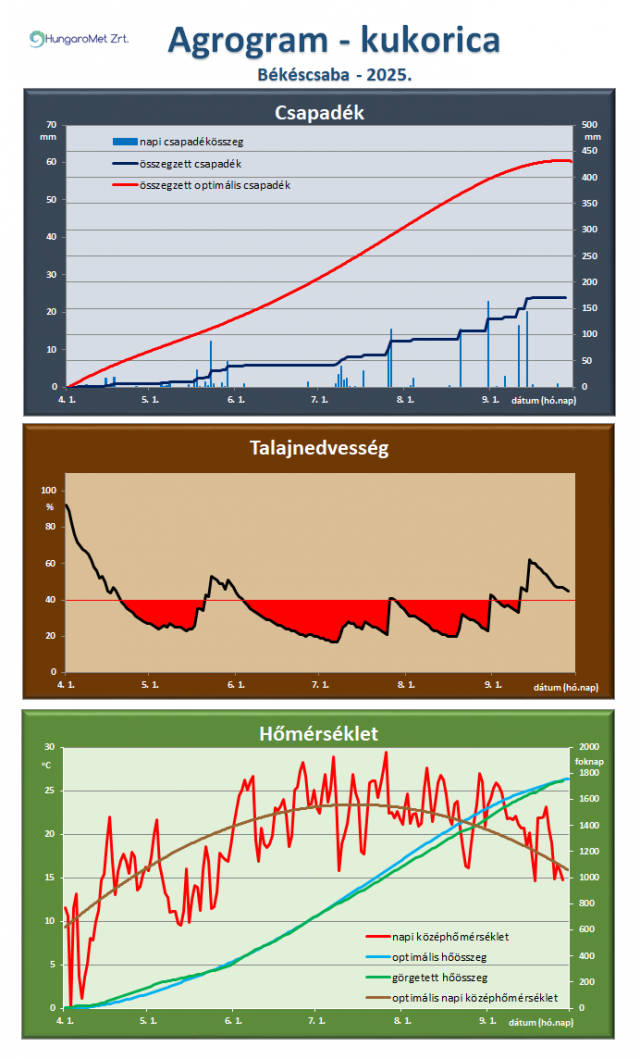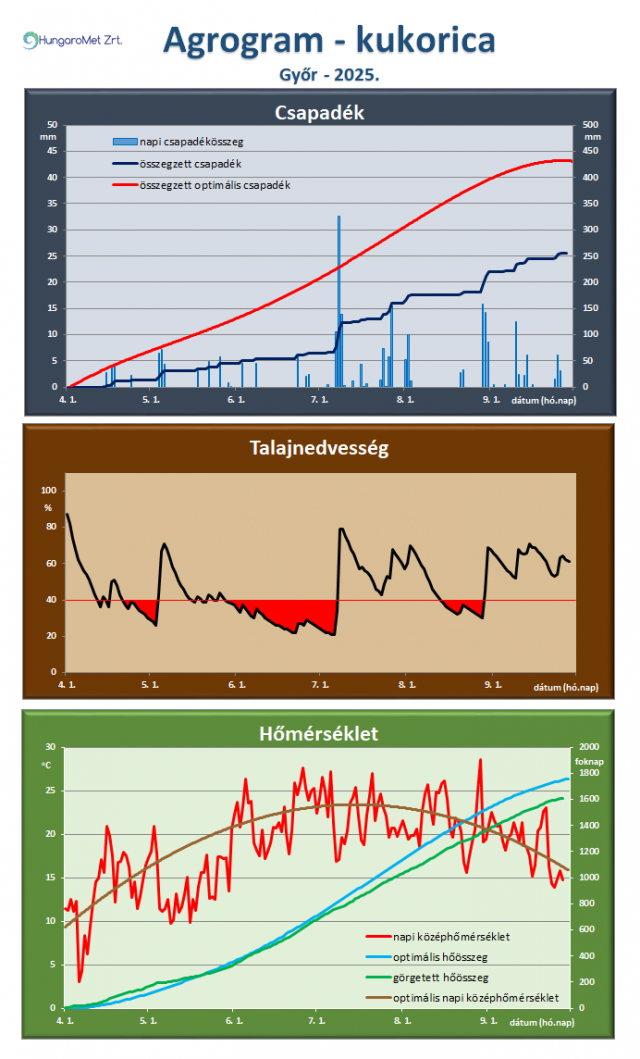 * A kukorica számára ideális, illetve a tényleges időjárási paraméterek (csapadék, talajnedvesség, hőmérséklet) összevetése látható az agrogramnak elnevezett ábrán a növény vegetációs időszakában. A legfelső, a csapadékot ábrázoló grafikonon megjelenik a napi csapadék (bal oldali tengelyen), az időszak során összegzett és a növény számára optimális összegzett csapadék (jobb oldali tengelyen). Így jól látszik a két utóbbi érték közötti eltérés, ami a csapadékhiányt vagy -többletet mutatja. A talajnedvesség ábrán a növények számára felvehető hasznos vízkészlet százalékában vannak megadva az értékek. A talajnedvesség május 15-ig a fölső 20 cm-es, majd ez után a fölső 50 cm-es réteg nedvességét mutatja. A már kritikusnak tekinthető 40%-os érték alatti időszakot pirossal emeljük ki. A hőmérséklet ábrán a ténylegesen mért érték mellett a növény számára optimális napi középhőmérsékletet (bal oldali tengelyen), valamint a görgetett hőösszeget (10 Celsius fokos bázissal) és ennek optimális értékeit mutatjuk be (jobb oldali tengelyen).