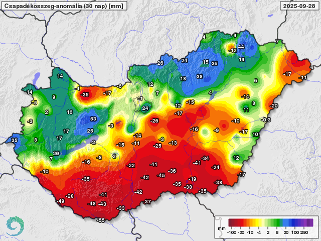 Az elmúlt 30 nap csapadékösszegének eltérése a sokéves átlagtól 2025. szeptember 28-ig (mm)