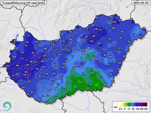 30 napos csapadékösszeg 2025. szeptember 28-ig (mm)