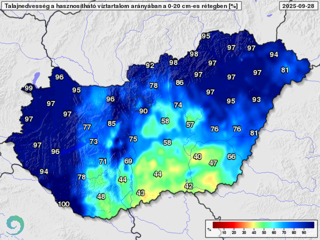 Talajnedvesség a talaj felső 20 centiméteres rétegében a növények számára hasznosítható vízmennyiség arányában 2025. szeptember 28-án (%)