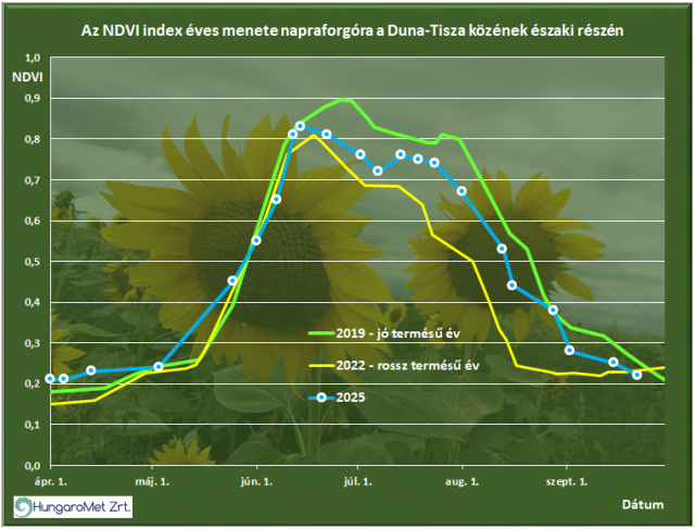 Az NDVI műholdas vegetációs index éves menete a tenyészidőszak során napraforgó táblákon (8 véletlenszerűen kiválasztott tábla átlaga) a Duna-Tisza közének északi részén a Sentinel-2 műholdak mérései alapján egy jó és egy