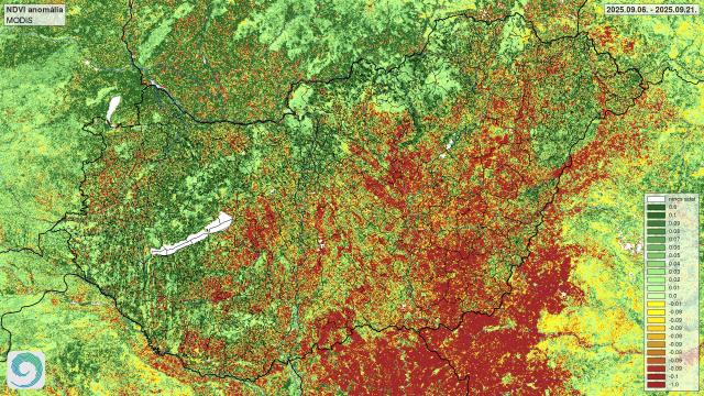 Az NDVI vegetációs index térképeink a szeptember közepére vonatkozó állapotot mutatják. Az index értéke az ország nagyobb részén nem csökkent számottevően, ami az év ezen időszakában természetes lenne, hanem növekedett a csapadékos és meleg időjárás hatására. Az anomália térképen jelentősen csökkent az Alföldön és a Dunántúl keleti tájain a nyári aszály hatását mutató negatív eltérésű terület nagysága. A nyugati és északi országrészekben valamint a keleti határszélen pedig az átlagosnál több zöld tömeg figyelhető meg (10. ábra).