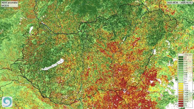 Az NDVI műholdas vegetációs index eltérése a sokéves átlagtól a 2025. szeptember 30. és október 15. közötti időszakban