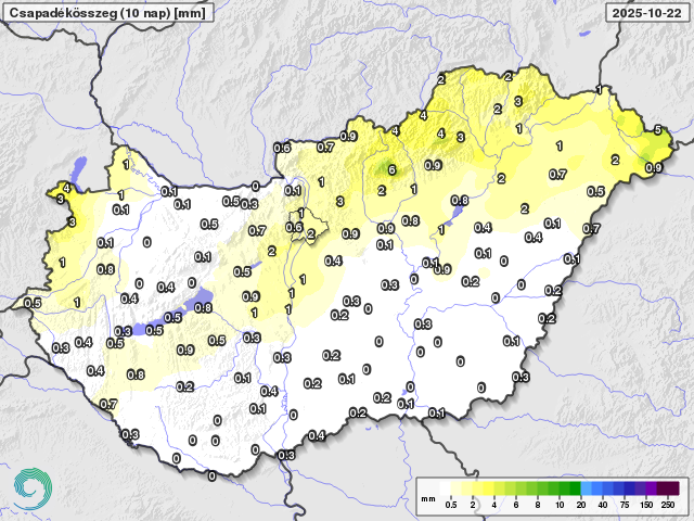10 napos csapadékösszeg 2025. október 22-ig (mm)