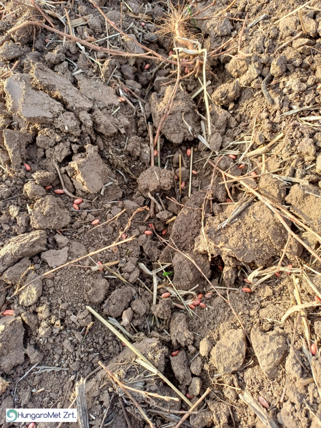 Elvetett búzatáblában a fordulónál a felszínen maradt búzaszemek Miskolc térségében 2025. október 22-én (fotó: Kovács Attila)