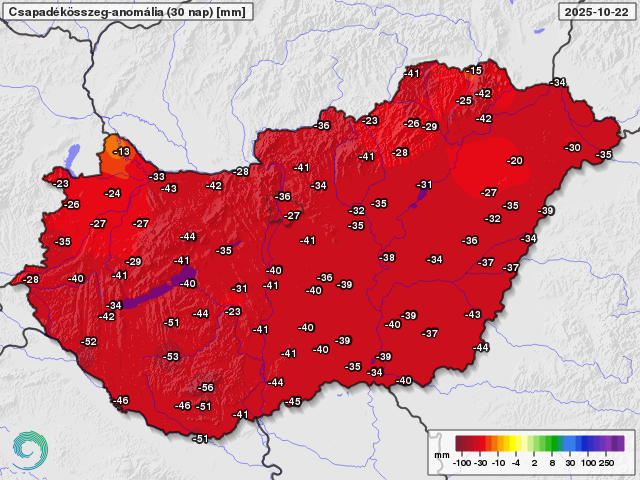 Az elmúlt 30 nap csapadékösszegének eltérése a sokéves átlagtól 2025. október 22-ig (mm)