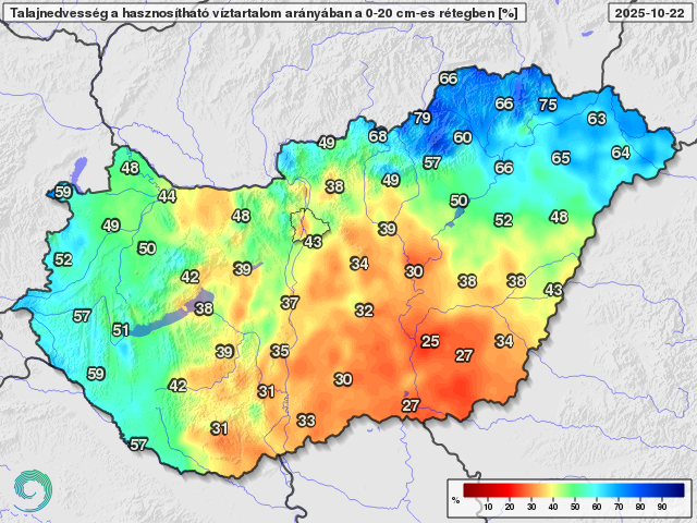 Az elmúlt egy héten is megmaradt az északnyugatias áramlás térségünk fölött, mely csapadékot alig hozott. Több napon is esett kevés eső, de a csapadék mennyisége az elmúlt 10 nap során csaknem országszerte 5 mm alatt maradt (1. ábra). A 30 napos csapadékösszeg az egész országban hiányt mutat, mely helyenként eléri az 50 mm-t is (2. ábra). A 90 napos összegben szinte az egész országban jelentős, mintegy 40-130 mm az elmaradás az átlaghoz képest (3. ábra). A talaj fölső 30-60 cm-es talajrétege a Dunántúl nyugati felén és az északi országrészben még tartalmaz nedvességet, bár az elmúlt hetek során nagyon sokat száradt a fölső réteg. Az Alföldön viszont szinte csontszáraz a fölső talajréteg is (4. ábra), 50-60 cm-nél mélyebben pedig csaknem országszerte igen szárazak a talajok.