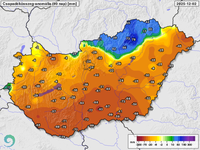 Az elmúlt 90 nap csapadékösszegének eltérése a sokéves átlagtól 2025. december 2-ig (mm)