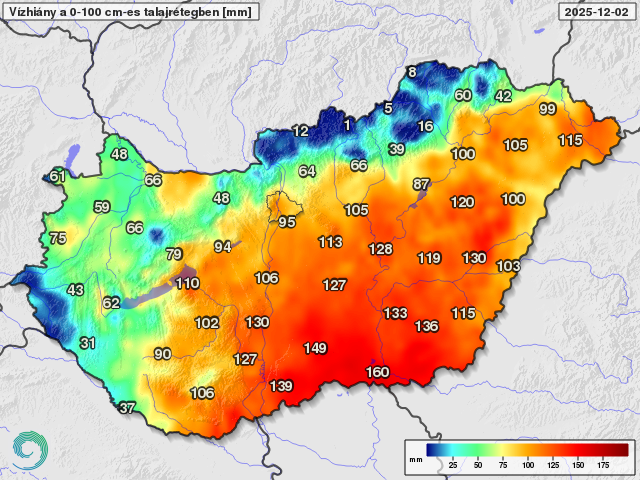 A talaj felső egy méteres rétegének telítettséghez képesti vízhiánya 2025. december 2-án (mm)