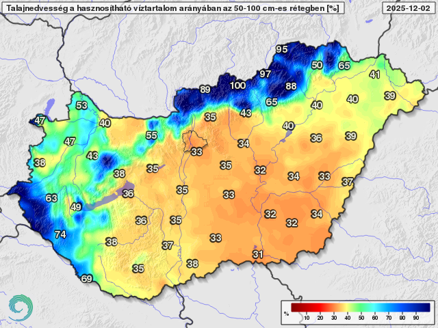 Talajnedvesség a talaj 50-100 centiméteres rétegében a növények számára hasznosítható vízmennyiség arányában 2025. december 2-án (%)