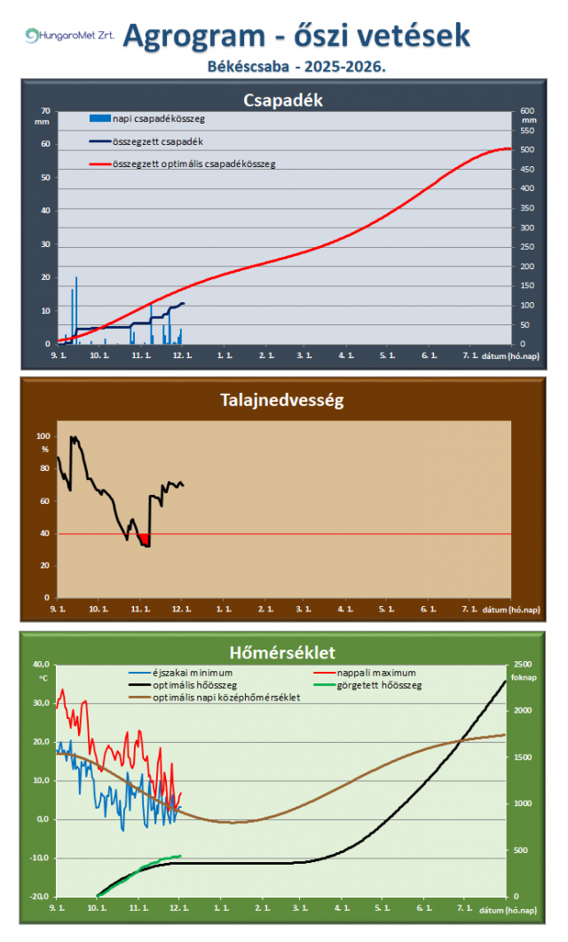 Az őszi vetésű kalászosok és a repce számára ideális, illetve a tényleges időjárási paraméterek (csapadék, talajnedvesség, hőmérséklet) összevetését mutatjuk be ezúttal a Békéscsaba és Győr körüli területre vonatkozó agrogramokon* (11. és 12. ábra). Szeptember első felében országszerte megszűnt vagy jelentősen mérséklődött a nyár nagy részére jellemző aszály. A csapadék igen jól jött a frissen elvetett repce csírázásához és keléséhez, amit ezt követően száraz, nyáriasan meleg idő segített. Szeptember utolsó hetében hűlt le jelentősen az idő, és bár többször, többfelé voltak kisebb esők, záporok, összességében szeptemberben és október első két dekádjában is jóval kevesebb csapadék hullott a szokásosnál. A repce szeptemberben jellemzően kellően megerősödött (bár a déli országrészben hiányosan kelt táblák is előfordultak), az őszi kalászosokat főként az Alföldön száraz, poros talajba vetették. Október utolsó dekádjában érkezett országos csapadék, ami sokat segített az állományok korai fejlődésében, de a délkeleti országrészben nem esett elegendő, arrafelé csak november második hétvégéjén nedvesedett át a talaj fölső rétege. November második felében országszerte jelentős csapadék hullott részben hó formájában, és bár ekkor is a délkeleti országrészben esett a kisebb mennyiség, de az őszi vetések gyökérzónája ott is átnedvesedett. A szeptember elejétől összegzett csapadékmennyiség hazánk jelentős részén az optimális körül alakul, vagy kissé marad el attól, az Alföldön jellemző 30-40 mm hiány, míg északon helyenként jóval (70-80 mm-rel) meghaladja az optimális értéket. A hőösszeg azonban az optimális érték közelében vagy a fölött alakul.