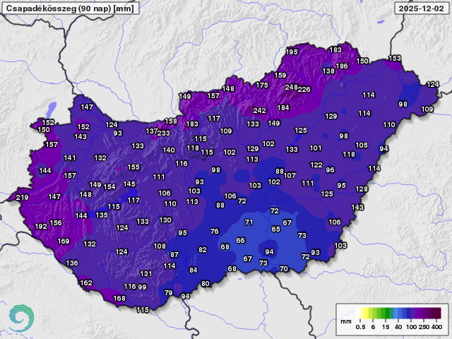 90 napos csapadékösszeg 2025. december 2-ig (mm)