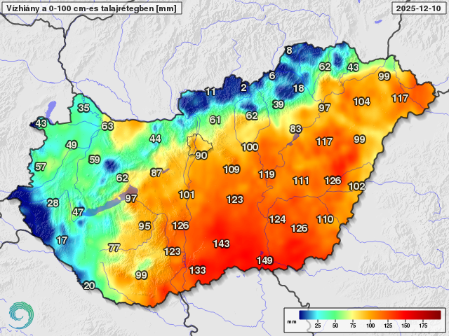 A mögöttünk álló egy hétben enyhe, de változékony időjárásban volt részünk. Csütörtökön és pénteken a Dunántúl nyugati kétharmadán hullott számottevő, 10-15 mm eső, keletebbre jóval kevesebb esett, majd szombat estétől vasárnapig a Tisza déli szakaszának környékén mérhettünk 5 mm körüli mennyiséget, míg máshol csak 0-3 mm hullott. A hét első felében csak gyenge esők fordultak elő hazánk északi felén. Így az elmúlt 10 nap csapadékösszege csak az Alföld egyes tájain és a nyugati országrészben haladja meg az 5 mm-t, utóbbi területeken 10-20 mm is esett, ugyanakkor hazánk jelentős részén csak 1-3 mm-t vagy ennyit sem mérhettünk (1. ábra). A 30 napos csapadékösszeg azonban a november utolsó dekádjában lehullott nagyobb mennyiségnek köszönhetően az ország túlnyomó részén az ilyenkor szokásos érték körül vagy azt meghaladóan alakult, északon és délnyugaton a sokéves átlaghoz képesti többlet a 20-60 mm-t is eléri, keleten, és délen viszont 5-15 mm hiány tapasztalható (2. ábra). A 90 napos csapadékmennyiségben továbbra is jelentős hiány figyelhető meg, csak az Északi-középhegységben esett nagy területen több az ilyenkor szokásosnál (3. ábra). A talaj felszín közeli része telítettséghez közeli állapotban van, és hazánk jelentős részén a középső talajréteg vízellátottsága is kielégítő, bár az Alföldön vannak szárazabb foltok (4. ábra). A fél méternél mélyebb talajrétegbe azonban csak az északi és nyugati országrészekben jutott számottevő nedvesség, az Alföldön és a Dunántúl keleti felén még alig töltődtek a talajok (5. ábra), az Alföldön a felső egy méteres réteg vízhiánya a telítettséghez képest még mindig meghaladja a 100 mm-t (6. ábra).