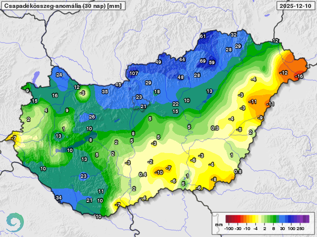Az elmúlt 30 nap csapadékösszegének eltérése a sokéves átlagtól 2025. december 10-ig (mm)