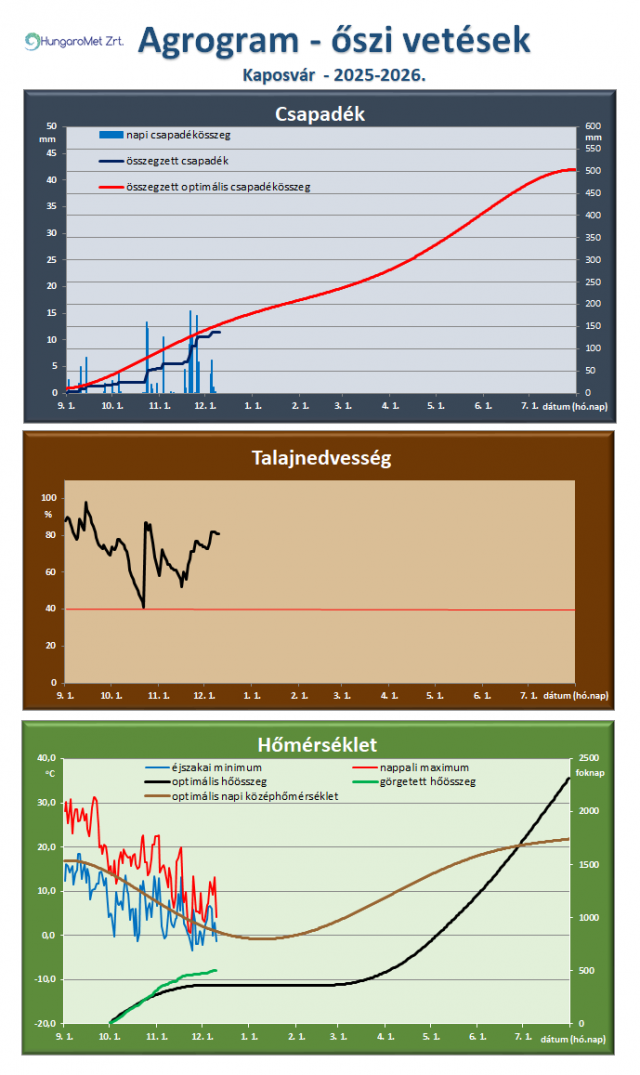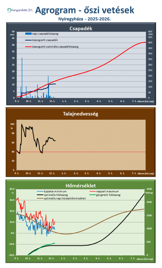 * Az őszi vetésű kalászosok és az őszi káposztarepce számára ideális, illetve a tényleges időjárási paraméterek (csapadék, talajnedvesség, hőmérséklet) összevetése látható az agrogramnak elnevezett ábrán. A legfelső, a csapadékot ábrázoló grafikonon megjelenik a napi csapadék (bal oldali tengelyen), az időszak során összegzett és a növény számára optimális összegzett csapadék (jobb oldali tengelyen). Így jól látszik a két utóbbi érték közötti eltérés, ami a csapadékhiányt vagy -többletet mutatja. A talajnedvesség ábrán a növények számára felvehető hasznos vízkészlet százalékában vannak megadva az értékek. November 20-ig a talaj felső 20 cm-es rétegét, a későbbiekben a felső 50 cm-es rétegének nedvességtartalmát ábrázoljuk. A már kritikusnak tekinthető 40%-os érték alatti időszakot pirossal emeljük ki. A hőmérséklet ábrán a napi hőmérsékleti szélsőértékek mellett a növény számára optimális napi középhőmérsékletet (bal oldali tengelyen), valamint a görgetett hőösszeget (2 Celsius fokos bázissal) és ennek optimális értékeit mutatjuk be (jobb oldali tengelyen).