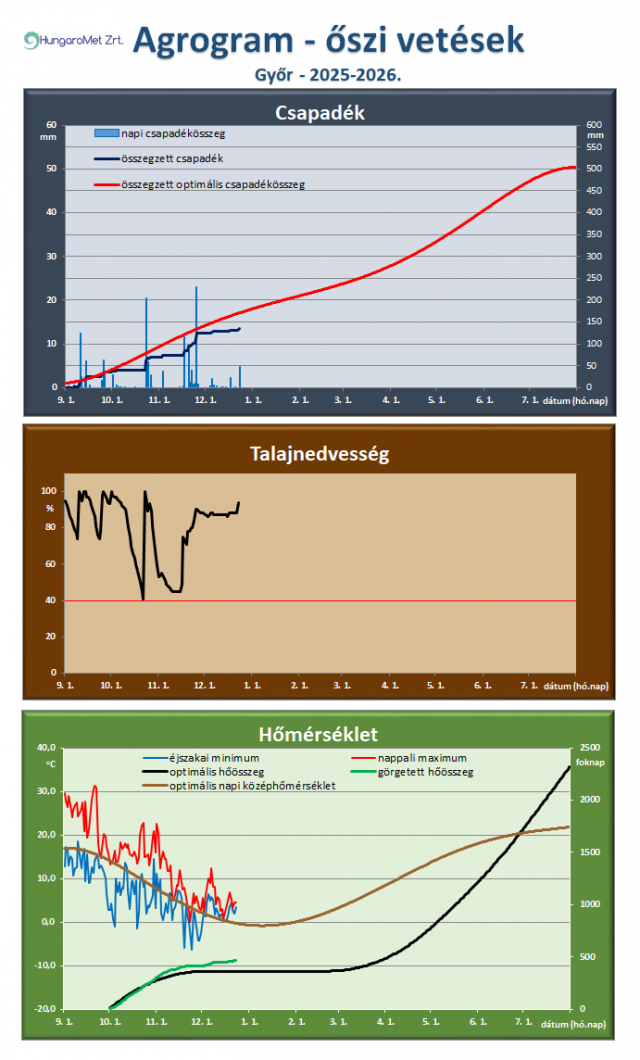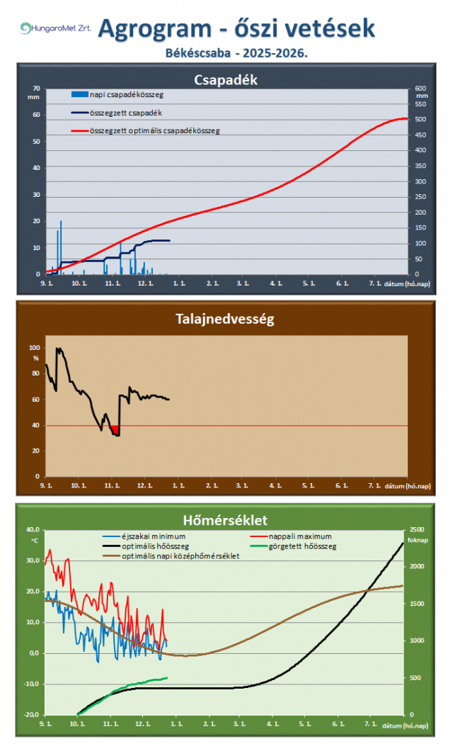 * Az őszi vetésű kalászosok és az őszi káposztarepce számára ideális, illetve a tényleges időjárási paraméterek (csapadék, talajnedvesség, hőmérséklet) összevetése látható az agrogramnak elnevezett ábrán. A legfelső, a csapadékot ábrázoló grafikonon megjelenik a napi csapadék (bal oldali tengelyen), az időszak során összegzett és a növény számára optimális összegzett csapadék (jobb oldali tengelyen). Így jól látszik a két utóbbi érték közötti eltérés, ami a csapadékhiányt vagy -többletet mutatja. A talajnedvesség ábrán a növények számára felvehető hasznos vízkészlet százalékában vannak megadva az értékek. November 20-ig a talaj felső 20 cm-es rétegét, a későbbiekben a felső 50 cm-es rétegének nedvességtartalmát ábrázoljuk. A már kritikusnak tekinthető 40%-os érték alatti időszakot pirossal emeljük ki. A hőmérséklet ábrán a napi hőmérsékleti szélsőértékek mellett a növény számára optimális napi középhőmérsékletet (bal oldali tengelyen), valamint a görgetett hőösszeget (2 Celsius fokos bázissal) és ennek optimális értékeit mutatjuk be (jobb oldali tengelyen).