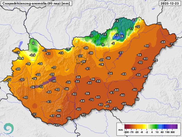 Az elmúlt 90 nap csapadékösszegének eltérése a sokéves átlagtól 2025. december 23-ig (mm)
