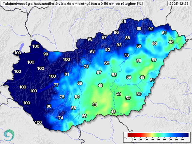 Talajnedvesség a talaj felső fél méteres rétegében a növények számára hasznosítható vízmennyiség arányában 2025. december 23-án (%)