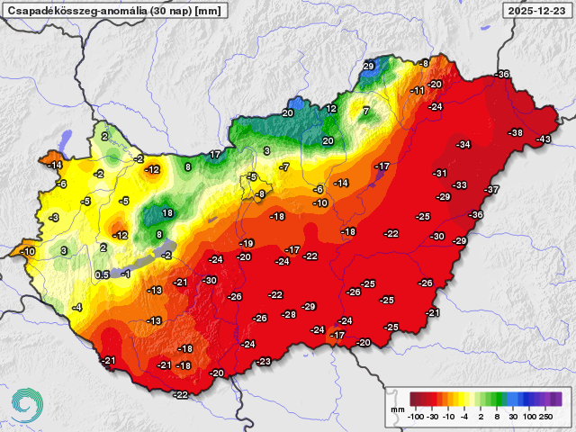 Az elmúlt 30 nap csapadékösszegének eltérése a sokéves átlagtól 2025. december 23-ig (mm)
