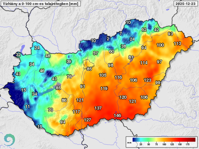 A talaj felső egy méteres rétegének telítettséghez képesti vízhiánya 2025. december 23-án (mm)