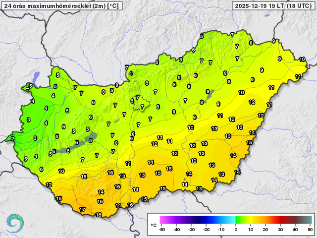 Maximum hőmérsékletek 2025. december 19-én (Celsius fok)
