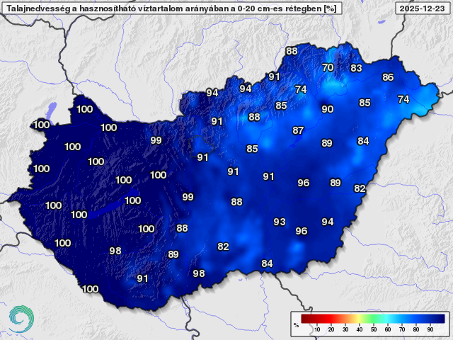 Talajnedvesség a talaj felső 20 cm-es rétegében a növények számára hasznosítható vízmennyiség arányában 2025. december 23-án (%)