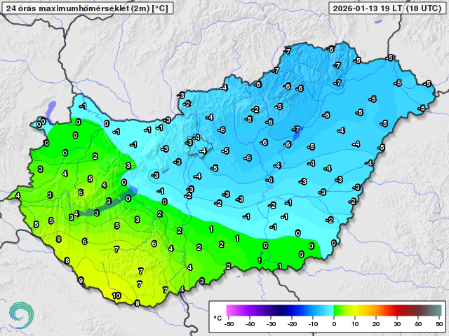 Maximum hőmérsékletek 2026. január 13-án (Celsius fok)