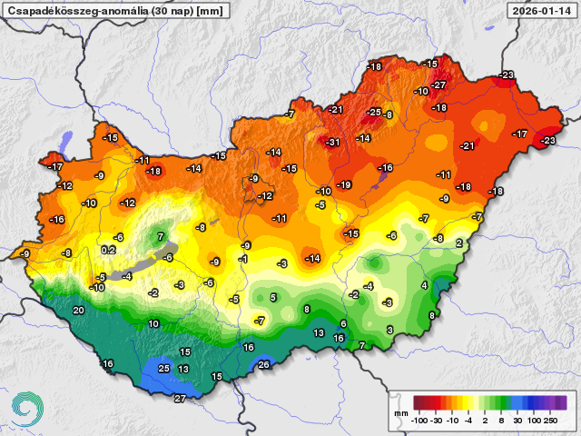 Az elmúlt 30 nap csapadékösszegének eltérése a sokéves átlagtól 2026. január 14-ig (mm)