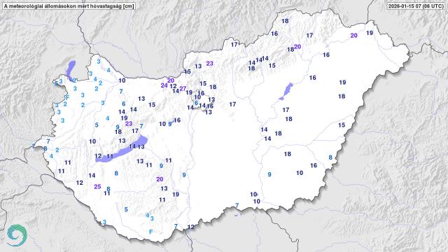 A hőmérséklet az elmúlt egy hétben is 3-8 fokkal a sokéves átlag alatt alakult. A leghidegebb a múlt pénteken és hétfőn volt, amikor a napi középhőmérséklet is -10 fok körül alakult a keleti országrészben, de máshol is -4 és -7 fok közöttinek adódott (5. ábra), éjszaka pedig pénteken az északi határ mentén és az Alföldön helyenként -20 fok alá hűlt a levegő, de országszerte hidegebb volt -10 foknál (6. ábra). A legtöbb helyen napközben is fagypont alatt maradt a hőmérséklet, csak a nyugati, délnyugati országrészben volt kissé enyhébb az idő. Kedden délen, délnyugaton jelentős enyhülés kezdődött, utóbbi tájakon napközben +10 fok fölé melegedett a levegő, míg továbbra is -4 - -7 fokot mérhettünk (7. ábra). A talajban nem alakult ki fagy a hóréteg szigetelő hatása miatt, igen gyenge talajfagy a felső 5-10 cm-en csak az északkeleti országrészben tapasztalható (8. ábra).