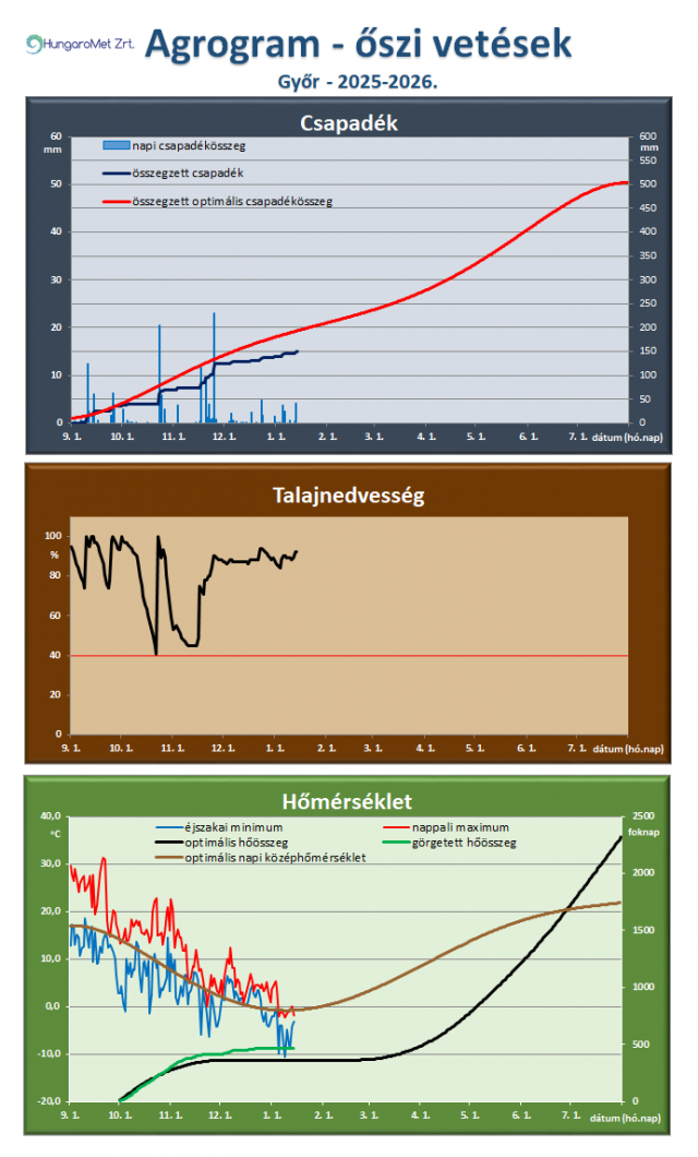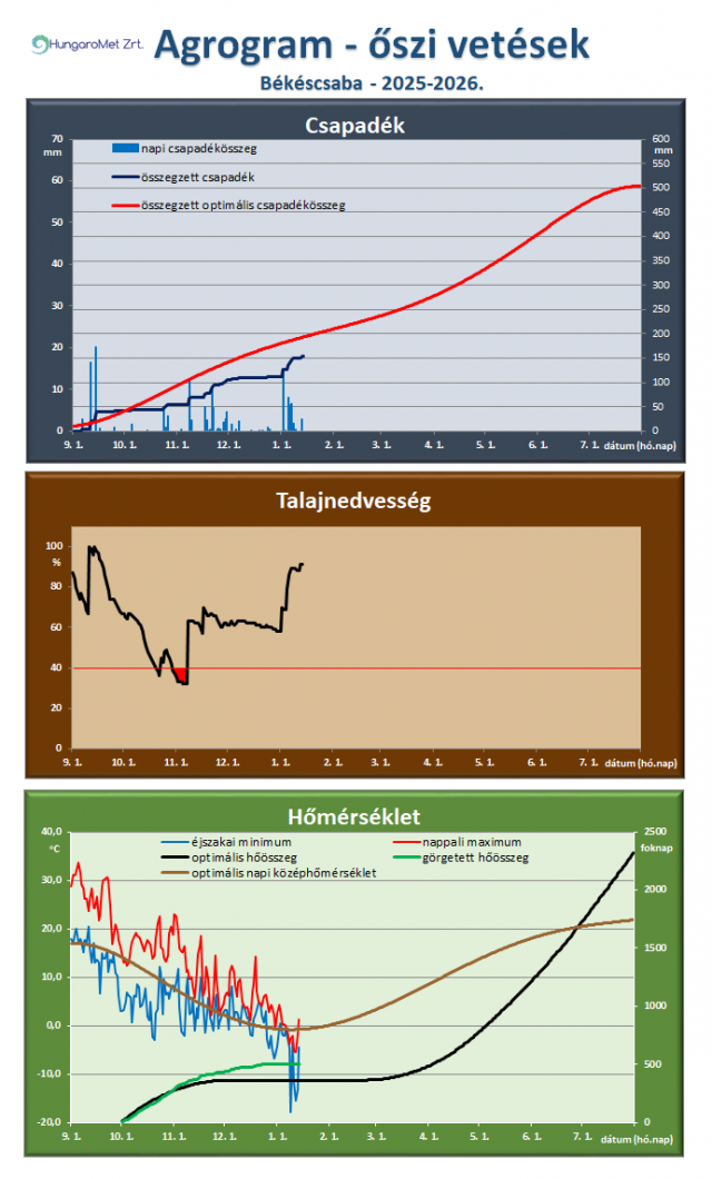 Az őszi vetésű kalászosok és a repce számára ideális, illetve a tényleges időjárási paraméterek (csapadék, talajnedvesség, hőmérséklet) összevetését mutatjuk be ezúttal a Békéscsaba és Győr körüli területre vonatkozó agrogramokon* (9. és 10. ábra). Szeptember első felében országszerte megszűnt vagy jelentősen mérséklődött a nyár nagy részére jellemző aszály. A csapadék igen jól jött a frissen elvetett repce csírázásához és keléséhez, amit ezt követően száraz, nyáriasan meleg idő segített. Szeptember utolsó hetében hűlt le jelentősen az idő, és bár többször, többfelé voltak kisebb esők, záporok, összességében szeptemberben és október első két dekádjában is jóval kevesebb csapadék hullott a szokásosnál. A repce szeptemberben jellemzően kellően megerősödött (bár a déli országrészben hiányosan kelt táblák is előfordultak), az őszi kalászosokat főként az Alföldön száraz, poros talajba vetették. Október utolsó dekádjában érkezett országos csapadék, ami sokat segített az állományok korai fejlődésében, de a délkeleti országrészben nem esett elegendő, arrafelé csak november második hétvégéjén nedvesedett át a talaj fölső rétege. November második felében országszerte jelentős csapadék hullott részben hó formájában, és bár ekkor is a délkeleti országrészben esett a kisebb mennyiség, de az őszi vetések gyökérzónája ott is átnedvesedett. Szinte az egész decembert őszies, borongós, szinte fagymentes és többnyire száraz idő jellemezte, sem hó, sem pedig hideg nem érkezett, így az Alföld talajainak 20-30 cm alatti rétegei szárazon fordultak 2026-ra. Az új év hideggel és havazással indult, január 8-ra országos, összefüggő hóréteg alakult ki, és többfelé -15 fok alá hűlt a levegő. Az őszi vetéseket a fagykártól a hóréteg védte.