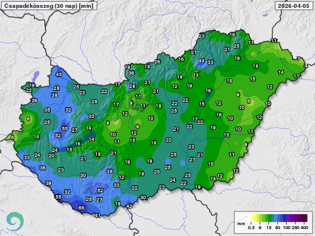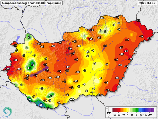 A mögöttünk álló néhány napban nagyrészt száraz, gyakran szeles, főként a Dunántúlon az ilyenkor szokásosnál hűvösebb idő volt a jellemző. Csapadék csak kevés hullott, a Dunántúl keleti felén és foltokban az Alföldön fordultak elő a múlt szerdán kisebb esők, záporok, illetve a ma átvonuló hidegfront hozott gyenge záporokat (1. ábra). Az elmúlt 30 nap csapadékmennyiségének java március utolsó hetében hullott, mikor többfelé esett 20-50 mm, ugyanakkor a Nyugat-Dunántúlon, a középső országrészben és a Tiszántúlon nagyobb területen csak 5-15 mm-t mérhettünk (2. ábra). A sokéves átlagtól vett eltérés ez utóbbi területeken mutat a legnagyobb, 15-25 mm-es hiányt, pozitív eltérés pedig csak kisebb foltokban tapasztalható (3. ábra). Az elmúlt 90 nap csapadékmennyisége is csak kevés helyen volt számottevően több a sokéves átlagnál, míg főként hazánk északnyugati felén többfelé 15-35 mm-rel kevesebb esett az ilyenkor szokásosnál (4. ábra).