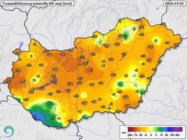 Az elmúlt 90 nap csapadékösszegének eltérése a sokéves átlagtól 2026. április 5-ig (mm)