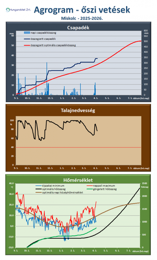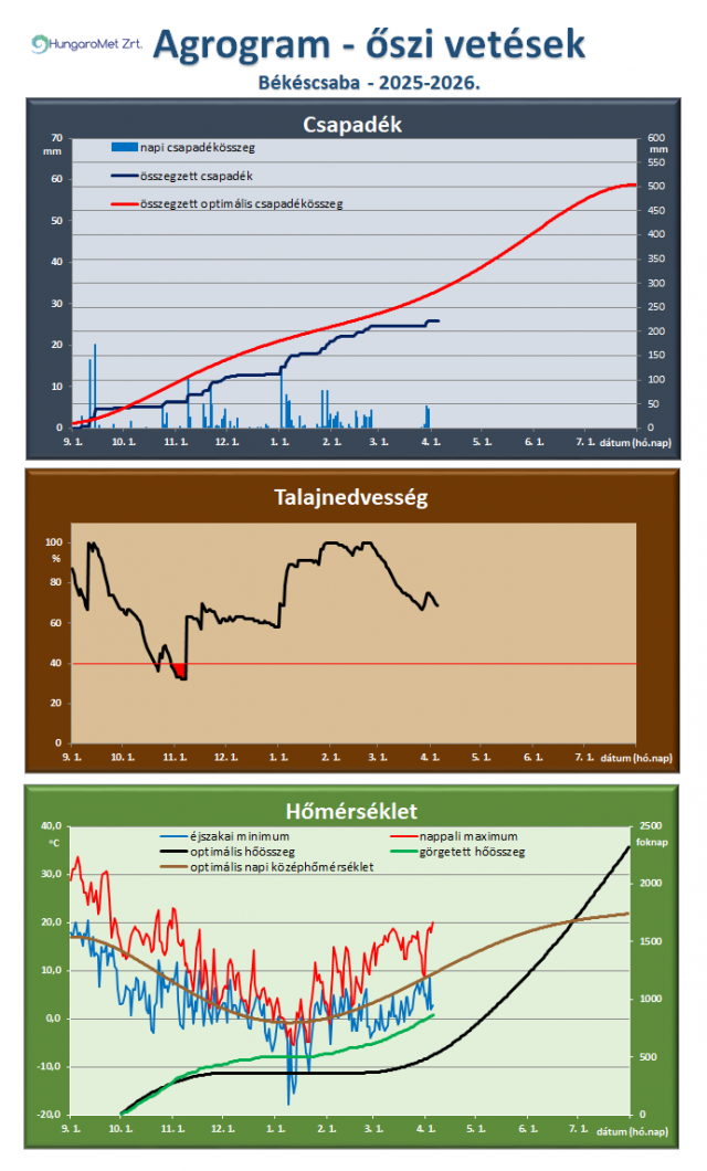 * Az őszi vetésű kalászosok és az őszi káposztarepce számára ideális, illetve a tényleges időjárási paraméterek (csapadék, talajnedvesség, hőmérséklet) összevetése látható az agrogramnak elnevezett ábrán. A legfelső, a csapadékot ábrázoló grafikonon megjelenik a napi csapadék (bal oldali tengelyen), az időszak során összegzett és a növény számára optimális összegzett csapadék (jobb oldali tengelyen). Így jól látszik a két utóbbi érték közötti eltérés, ami a csapadékhiányt vagy -többletet mutatja. A talajnedvesség ábrán a növények számára felvehető hasznos vízkészlet százalékában vannak megadva az értékek. November 20-ig a talaj felső 20 cm-es rétegét, a későbbiekben a felső 50 cm-es rétegének nedvességtartalmát ábrázoljuk. A már kritikusnak tekinthető 40%-os érték alatti időszakot pirossal emeljük ki. A hőmérséklet ábrán a napi hőmérsékleti szélsőértékek mellett a növény számára optimális napi középhőmérsékletet (bal oldali tengelyen), valamint a görgetett hőösszeget (2 Celsius fokos bázissal) és ennek optimális értékeit mutatjuk be (jobb oldali tengelyen).