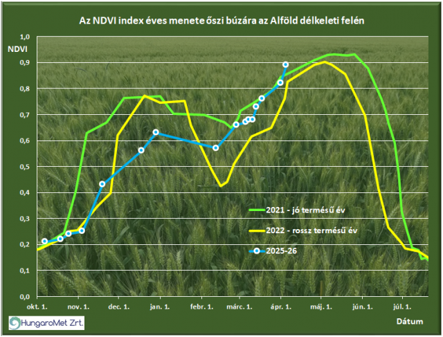 Az őszi vetések szépen növekednek, a szokásosnál előrébb járnak a fejlődésben, zöld tömegük intenzíven növekszik (8. ábra). A repce virágzik. A március végi csapadék rendkívül sokat ért, kisebb körzeteket leszámítva jelenleg szinte ideálisak a körülmények.