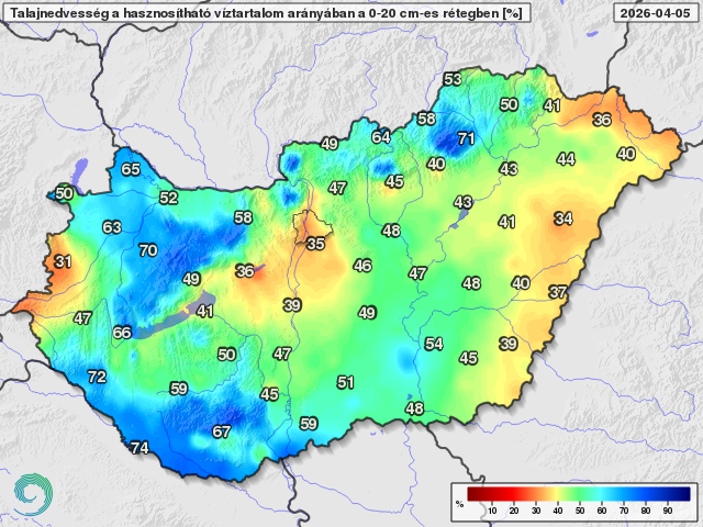 Talajnedvesség a talaj felső 20 centiméteres rétegében a növények számára hasznosítható vízmennyiség arányában 2026. április 5-én (%)