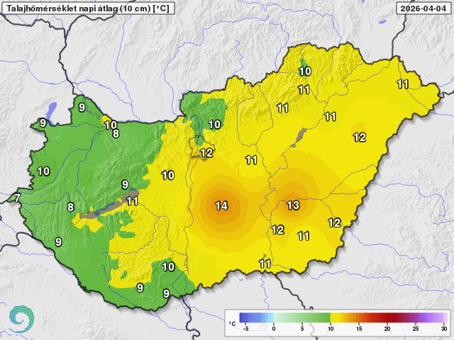 A talaj felső 20-30 cm-es rétege nagyon sokat száradt a múlt hét közepe óta, és ahol a megelőző időszakban nem hullott legalább 15-20 mm csapadék, ott mostanra kritikusan ki is szárast a felső 10 cm (5. ábra). A 30-60 cm-es réteg jellemzően országszerte jó vízellátottságú, a mélyebb rétegekből pedig főként az Alföldön hiányzik számottevő nedvesség, ami a tél során nem töltődött föl. Az 5 cm-es talajhőmérséklet az ország keleti felén már két hete megközelíti vagy meg is haladja a 10 fokot, a Dunántúlon azonban az elmúlt egy hétben jellemzően csak 5-8 fok között alakult (6. ábra).