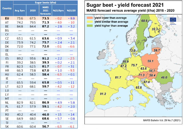 Cukorrépa termésátlag előrejelzés a 2016-2020-as átlaghoz viszonyítva (forrás: ec.europa.eu/jrc/en/mars)