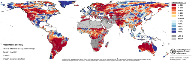 2021. július első dekádjában a csapadékösszeg eltérése a sokéves átlagtól (%). (forrás: www.fao.org)