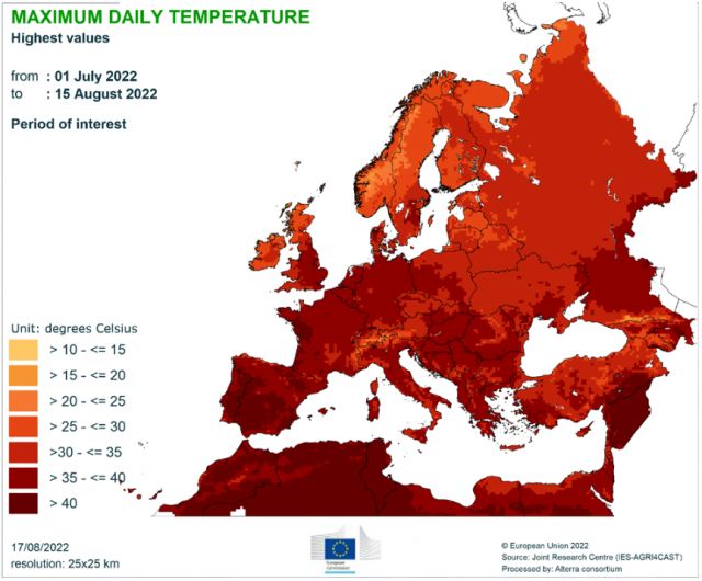 A 2022. július 1. és augusztus 15. közötti időszakban a rendkívül forró és száraz körülmények folytatódtak Európa legnagyobb részén (5. ábra). Ez a mezőgazdaságot és a nyári növényeket nagyon súlyosan érintette. A július végén csúcsosodó hőmérséklet és aszály leginkább Spanyolországot, Franciaországot, Olaszország északi és középső részét, Németország középső vidékeit és Magyarországot érintette, ráadásul éppen a nyári növények virágzásának fenológiai fázisában, így nagyon alacsony terméshozamok alakulnak ki. A víztározókban a legtöbb helyen nincs annyi víz, mint amennyire a növényeknek szüksége lenne. A kukoricát sokfelé lesilózták, mert annyira gyenge termést mutatott. A Benelux államokban, Németország és Lengyelország nyugati részén a magas hőmérséklet és csapadékhiány szintén károsan befolyásolta a nyári növények termésátlagait, de errefelé nem volt annyira kritikus a helyzet, mint a korábban felsorolt területeken. Szlovákia keleti, Románia keleti és déli részén, Bulgáriában, illetve Ukrajna déli területein szintén csapadékhiány volt és ezt súlyosbította a nagyon magas hőmérséklet, így itt is terméskiesés várható. A mérleg másik serpenyőjében viszont a csapadékhiány a kalászosok és a repce aratására kedvező volt a legtöbb országban, így az jól haladt és a minőség sem csökkent. Kivétel ez alól a Balti államok térsége, ahol a túl sok csapadék az aratást hátráltatta, és már a szemfejlődés és érés fázisára is negatívan hatott.