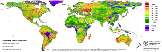 (VHI: Vegetation Health Index - ez egy műholdas mérésekből származtatott komplex index, mely röviden összefoglalva a növényzet egészségi szintjét mutatja: a zöld értékek egészséges, míg a sárga és vörös színek az aszályos növényzetet mutatják. A szürke, kék és rózsaszín területek hiányos adatokat, felhős és havas területeket jelölnek. A sivatagi részek értelmezése hosszabb leírást kíván.)