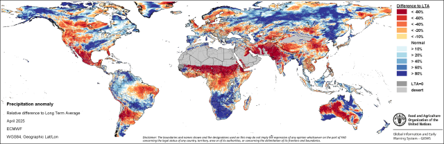 2025. ápriliss becsült csapadékösszegének eltérése a sokéves átlagtól (%) (forrás: www.fao.org)