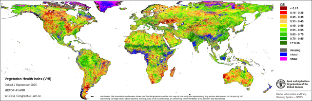 (VHI: Vegetation Health Index - ez egy műholdas mérésekből származtatott komplex index, mely röviden összefoglalva a növényzet egészségi szintjét mutatja: a zöld értékek egészséges, míg a sárga és vörös színek az aszályos növényzetet mutatják. A szürke, kék és rózsaszín területek hiányos adatokat, felhős és havas területeket jelölnek. A sivatagi részek értelmezése hosszabb leírást kíván.)
