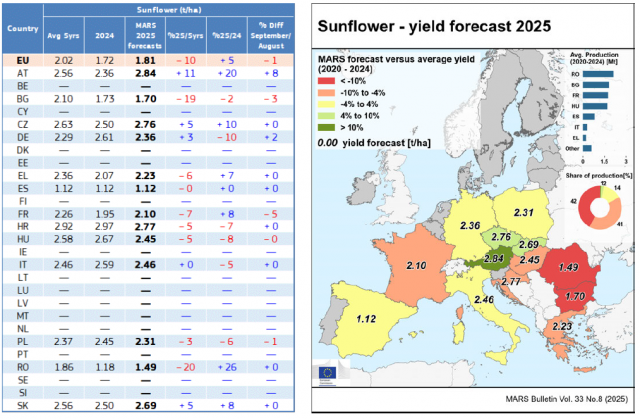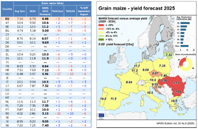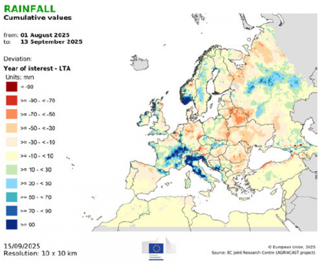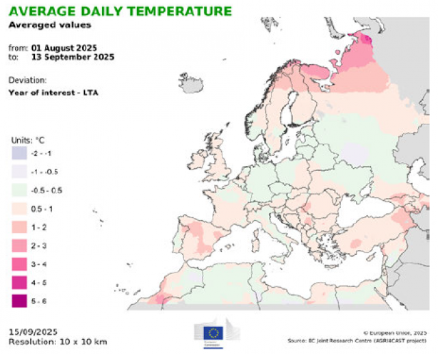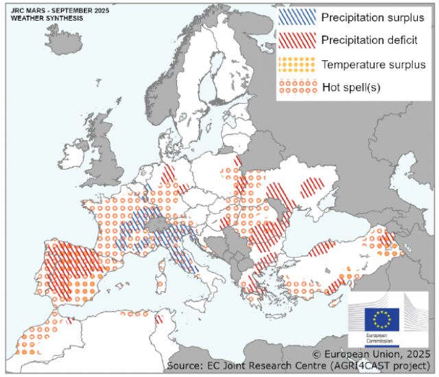 A délkelet-európai nyári aszály és az ismétlődő hőhullámok visszafordíthatatlan terméskiesést okoztak Magyarországon, Romániában, Bulgáriában és Törökország egyes részein. Leginkább a nyári kapásnövények, például a kukorica és a napraforgó érintettek, amelyek terméskilátásai jelentősen elmaradnak az ötéves átlagtól. Másutt a hőhullámok és száraz időszakok mérsékelt, csapadékosabb periódusokkal váltakoztak, ami összességében kedvező feltételeket biztosított a növényállomány számára. Nyugat- és Közép-Európában változatos, de összességében stabil hozamokat várnak, míg Észak-Európában az átlag feletti betakarítás várható. Az Ibériai-félszigeten az öntözés révén sikerült fenntartani a kielégítő terméskilátásokat.