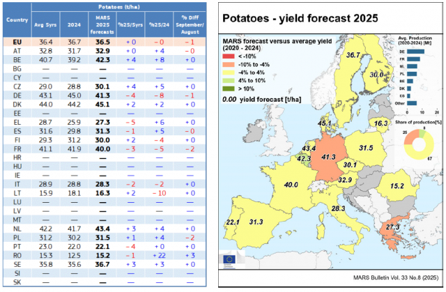 A cukorrépa és a burgonya hozam előrejelzése továbbra is az ötéves átlag alatt marad, míg a kukorica várható termése ahhoz közeli szinten alakul. A tavaszi vetésű növények előrejelzését azonban felfelé módosították, az ötéves átlag fölé, a betakarítás során tapasztalt rendkívül kedvező körülményeknek köszönhetően.