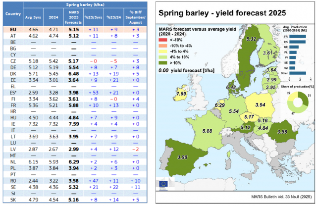 Tavaszi árpa termésátlag előrejelzés a 2020-2024-es átlaghoz viszonyítva (forrás: ec.europa.eu/jrc/en/mars) (az oszlopok balról jobbra a következőket tartalmazzák: ország, 5 éves termésátlag (t/ha),