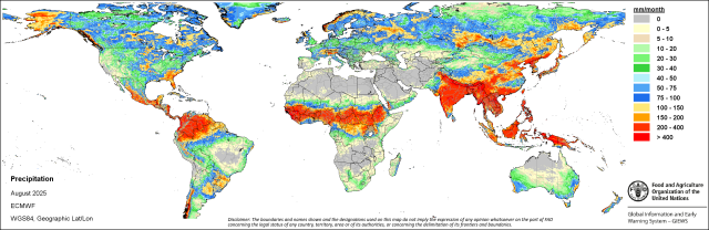 A 2025. augusztus havi becsült csapadékösszeg (mm) (forrás: www.fao.org)