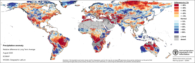 2025. augusztus becsült csapadékösszegének eltérése a sokéves átlagtól (%) (forrás: www.fao.org)