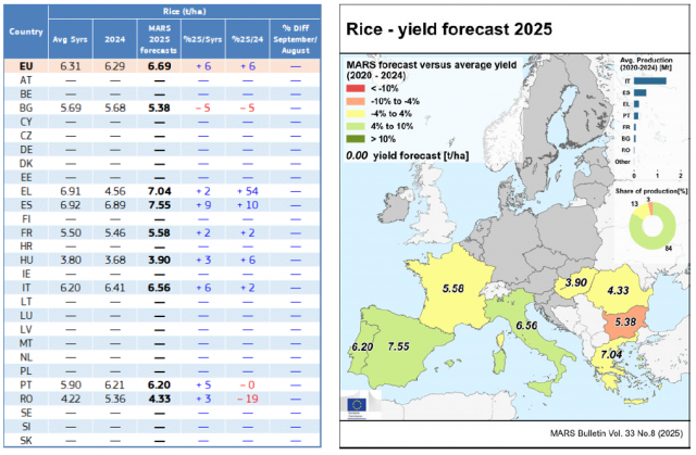 A rizs összesített terméskilátásai kedvezőek: Olaszország, Spanyolország, Portugália és Franciaország erős terméspotenciált mutatnak, ugyanakkor Dél-Spanyolországban, Bulgáriában, Romániában és Görögországban gyenge vagy közepes hozam várható. Az EU teljes rizstermése az előrejelzések szerint 6%-kal haladja meg az ötéves átlagot. (9-15. ábrák).