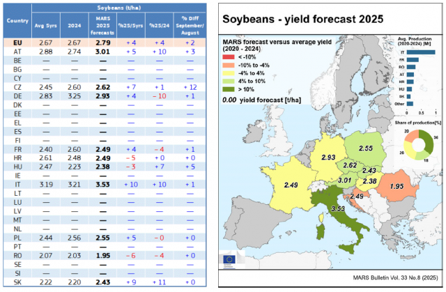 Szója termésátlag előrejelzés a 2020-2024-es átlaghoz viszonyítva (forrás: ec.europa.eu/jrc/en/mars) (az oszlopok balról jobbra a következőket tartalmazzák: ország, 5 éves termésátlag (t/ha),