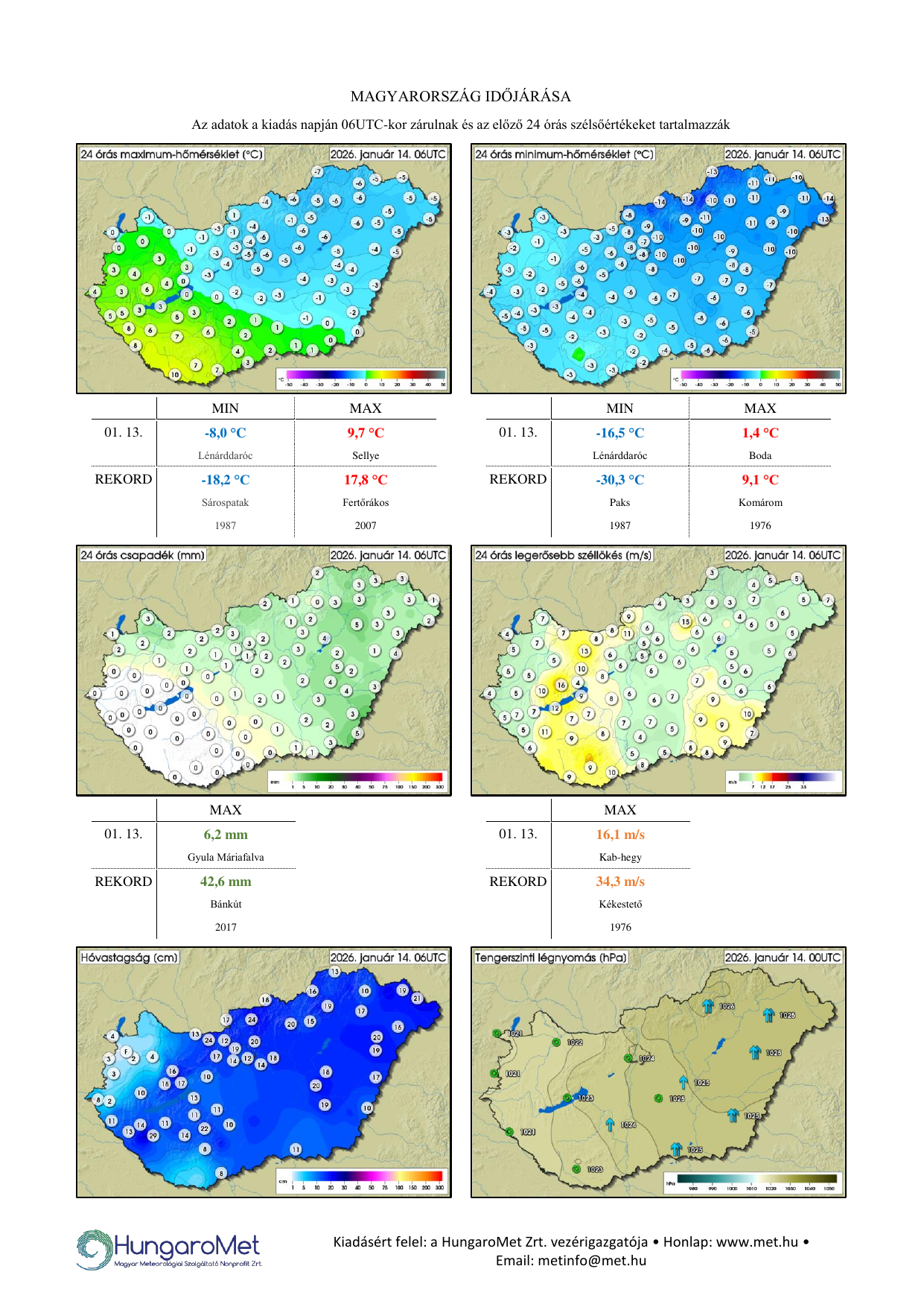 A meteorológiai elemek OMSZ által mért napi értékei ezentúl kontúrtérképeken jelennek meg, de továbbra is tartalmaznak konkrét számértékeket, a korábbinál jóval több állomásról. A térképek alatt táblázatos formában feltüntetjük a napi szélsőértékeket és az abszolút napi rekordadatokat. Az eddigiektől eltérően a napi (24 órás) adatok egységesen, 06 és 06 UTC közötti időszakot fednek le – nagyobb összhangban a nemzetközi gyakorlattal.